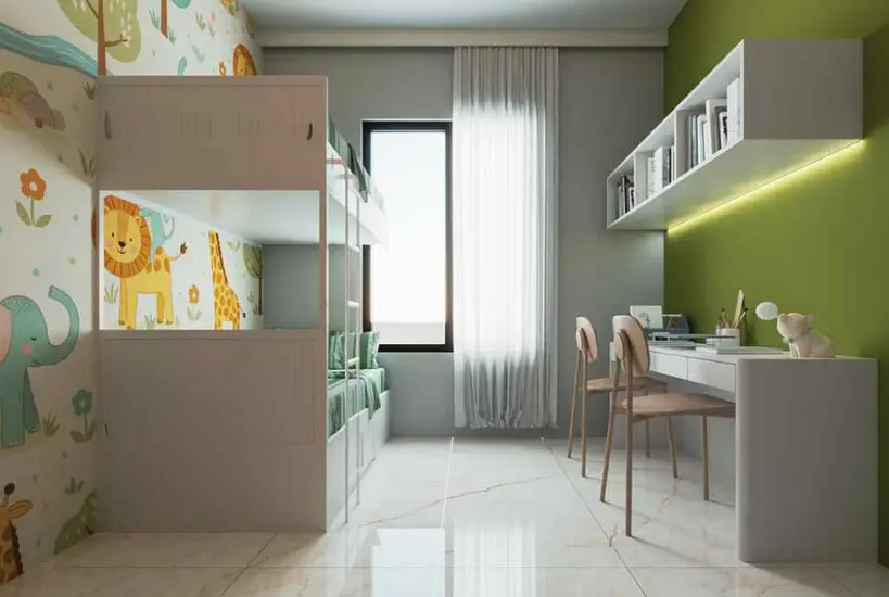 Interior layouts emphasize straight-line planning, allowing easy furniture placement and practical storage. Kitchens are fitted with granite platforms and stainless steel sinks, bathrooms use branded CP fittings, and vitrified flooring is specified across living areas. Large windows enhance daylight penetration, creating bright interiors throughout the day.