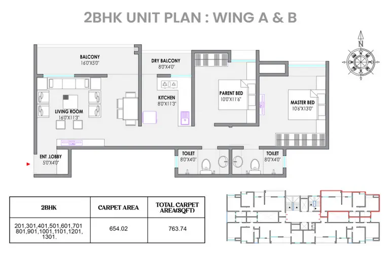2 BHK apartments feature a carpet area of approximately 654 sq ft, with total usable carpet (including balconies) around 763 sq ft.