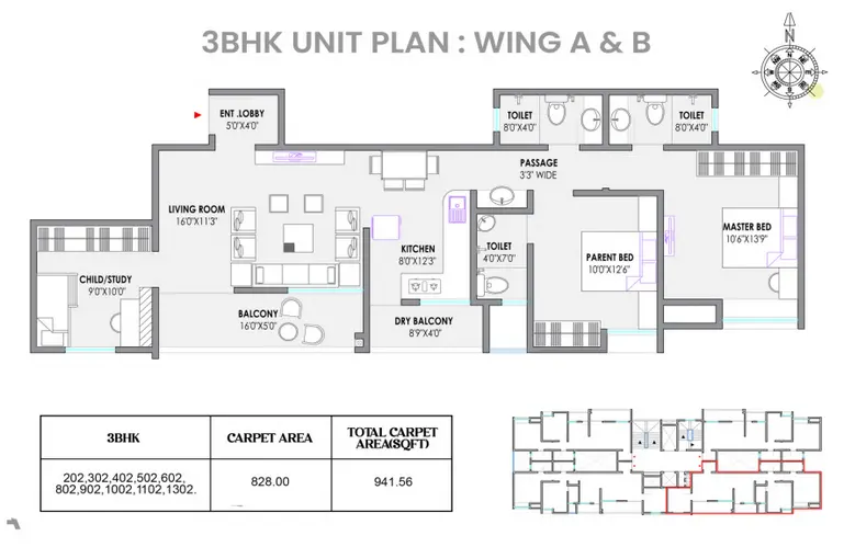 3 BHK apartments provide a carpet area of about 828 sq ft, expanding to roughly 941 sq ft with balconies.