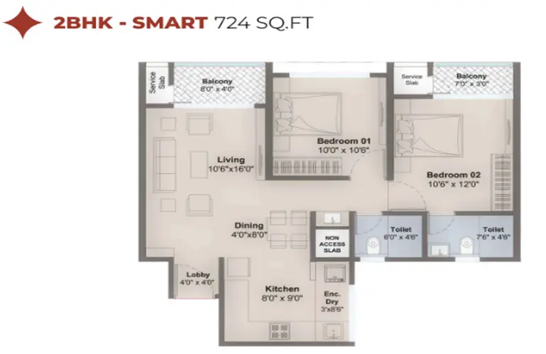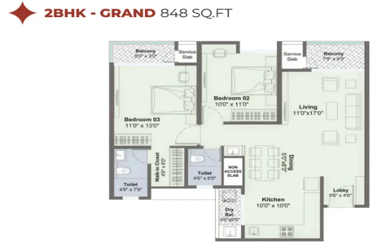 2 BHK: approximately 724 sq. ft. to 848 sq. ft.