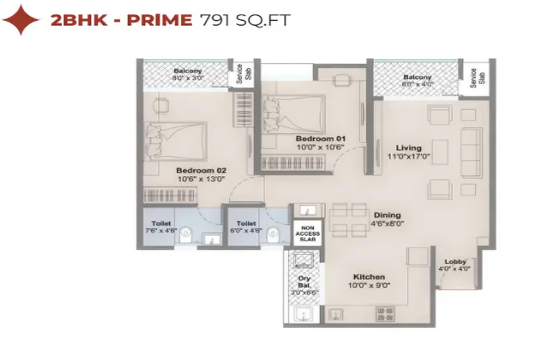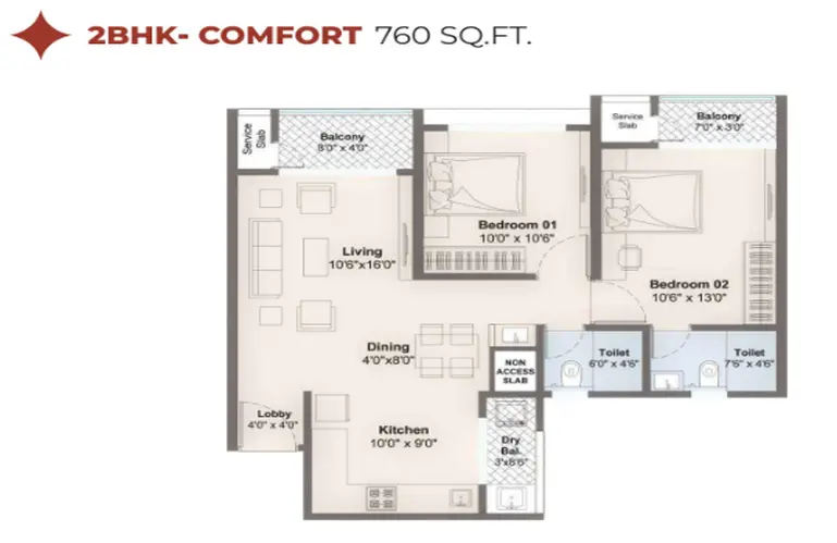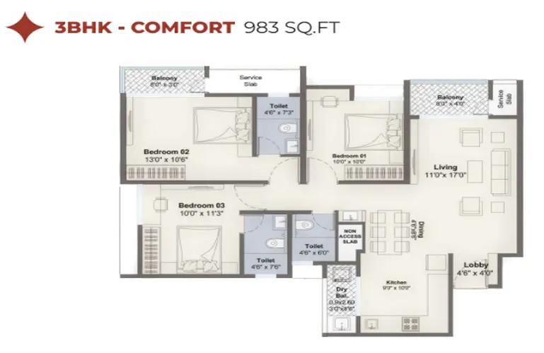 Each unit is designed around usable living spaces rather than oversized passages. Living and dining areas flow naturally into compact kitchens with dedicated dry balconies, while bedrooms are proportioned for standard wardrobes and comfortable movement. Most layouts include dual balconies and thoughtfully positioned bathrooms to enhance privacy between common and personal zones.