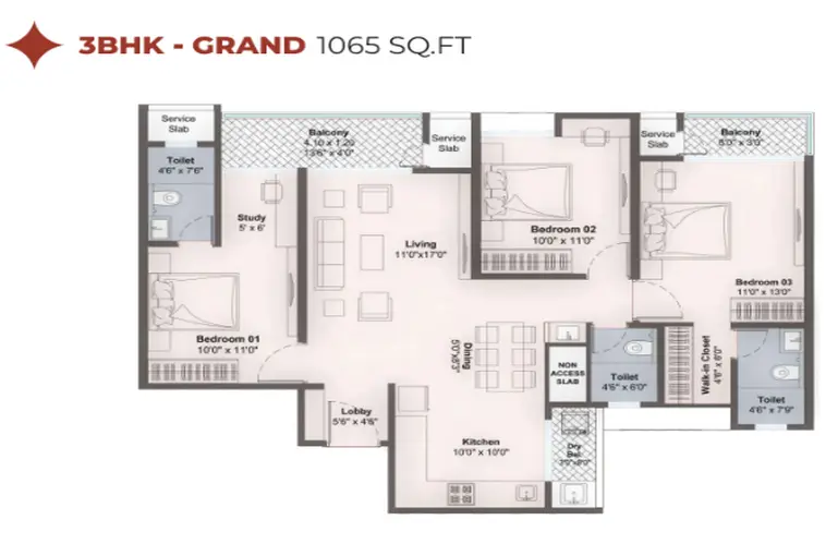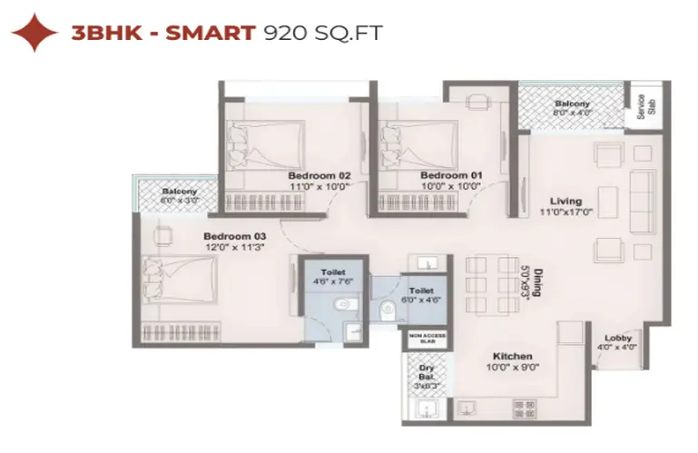 3 BHK: approximately 920 sq. ft. to 1065 sq. ft.