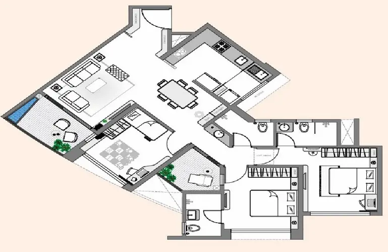 Type 2: 1052 sq.ft. – Extra-wide views, extended living spaces, and additional balcony areas that serve as private relaxation zones.
