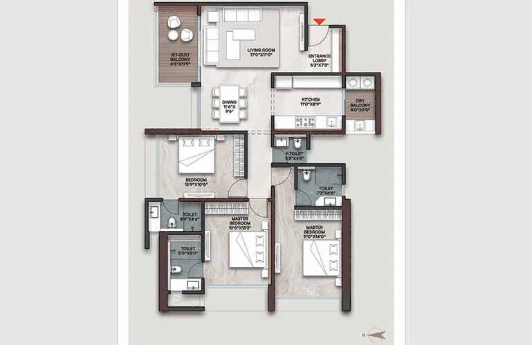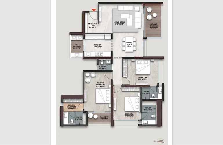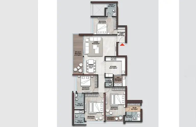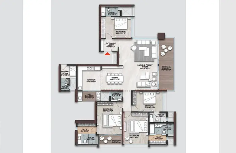 Inside, the residences are sanctuaries of elegance. Handpicked imported marble flooring, premium veneer finishes, and bespoke fittings whisper quiet luxury. Spacious 3 BHK, 4 BHK, and 5 BHK duplex residences come with super-sized layouts, floor-to-floor heights of 3.4 metres, en suite bathrooms, and powder rooms in every home. Thoughtfully planned terraces with laminated glass railings blur the boundary between indoor comfort and outdoor beauty.