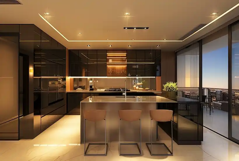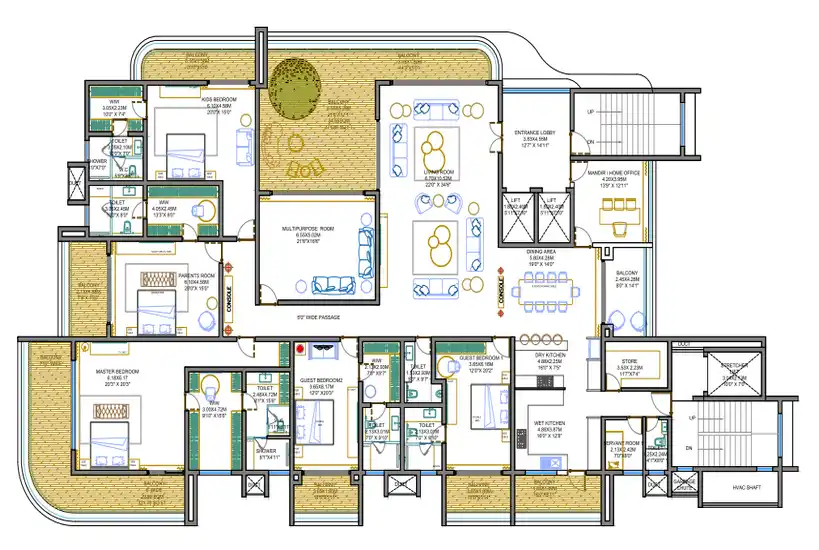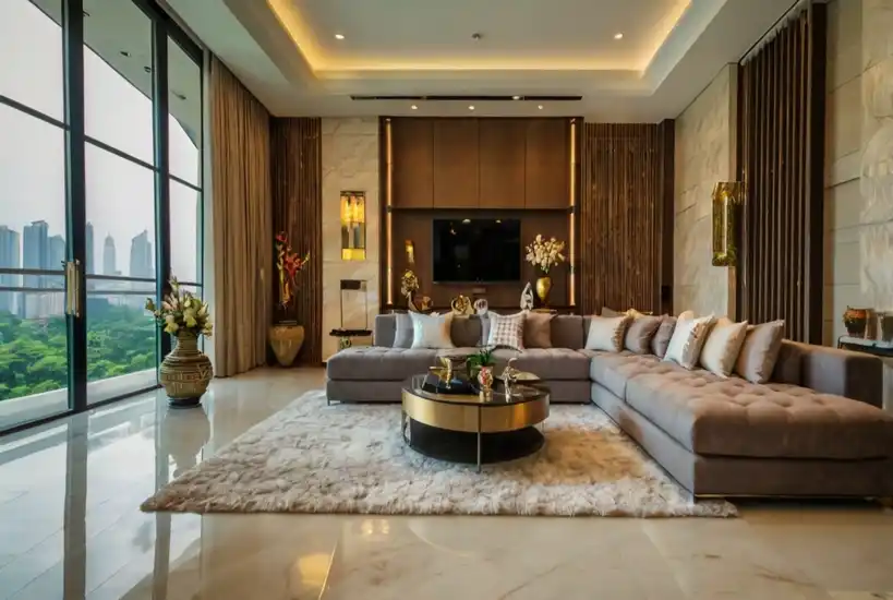 Each villa spans approx. 6848 sq.ft carpet area, designed like an independent luxury bungalow, but elevated high above the city. The living room is grand, airy and expansive, perfect for private family time or high-profile gatherings. Dining and lounge merge into open decks with panoramic skyline visuals, making every evening feel cinematic.