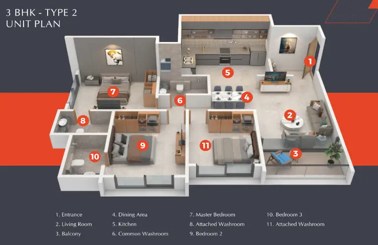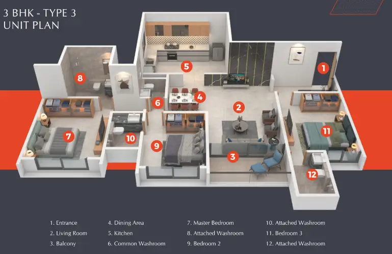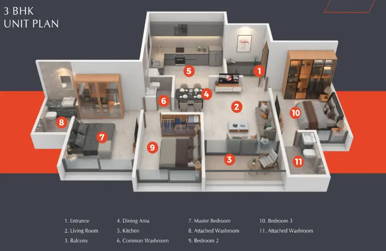 3 BHK Apartments: Designed for growing families, featuring expansive living spaces, multiple bathrooms, and enhanced privacy zones.