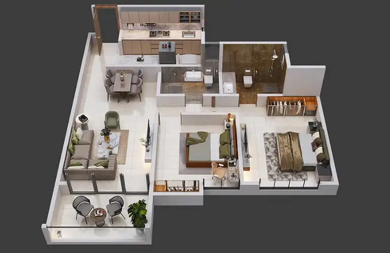 2 BHK residences are ideal for modern professionals and young families, offering efficient layouts with expansive living and dining areas.
