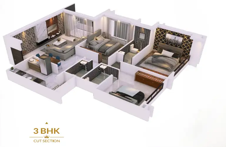 The 3 BHK residences offer enhanced space, including expansive living rooms, thoughtfully zoned bedrooms, and balconies that open into calming outdoor vistas—perfect for growing families who value comfort, flexibility, and lifestyle convenience.