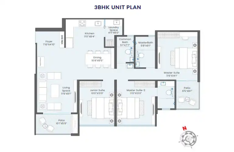 • 3 BHK residences offer generous living, connected balconies, smart spatial movement and a perfect balance between private and shared zones — well suited for evolving families.