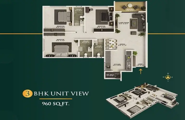 | A | 1102 (3 BHK) | 961 | ₹ 2.07 Cr |
