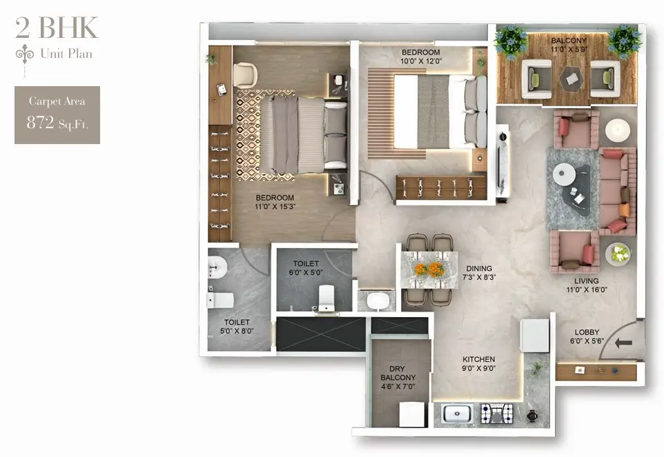 | 2 BHK | 872 | ₹1.72 Cr* |