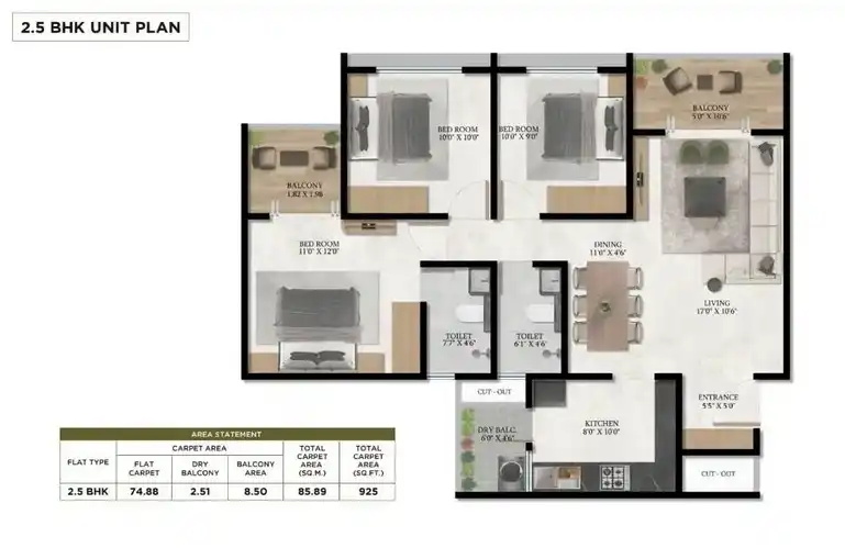 • 2.5 BHK – Flexible unit with extra utility space for work or kids