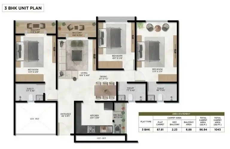 | Total Carpet Area + Balcony | 798 | 813 | 820 | 1043 |