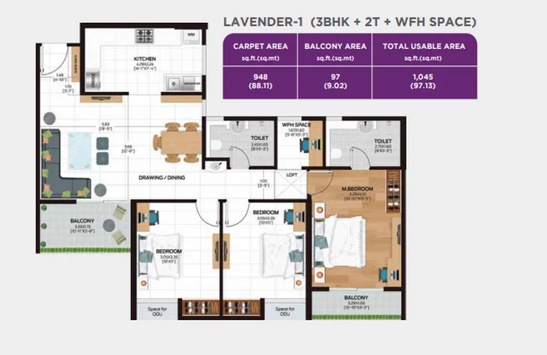 3 BHK (Lavender 1) 1045 1,01,74,000 11,49,000 1,13,23,000