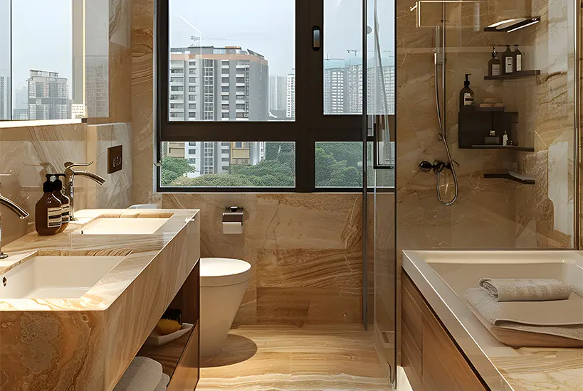 The bathrooms are finished to perfection — with designer tiles, premium fittings, and separate wet and dry areas. For the master bath, a bathtub and steam room transform everyday routines into spa-like indulgences.