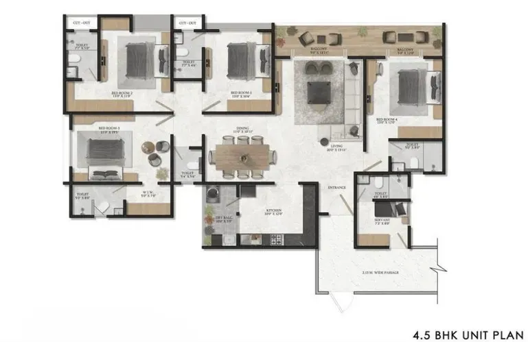 The 3 BHK Apartments are ideal for modern families seeking refined comfort and efficient space planning, while the 4.5 BHK Residences cater to buyers who desire enhanced luxury, additional flexibility, and a heightened sense of exclusivity. Every layout is thoughtfully planned to ensure privacy while maintaining a seamless flow between living spaces.