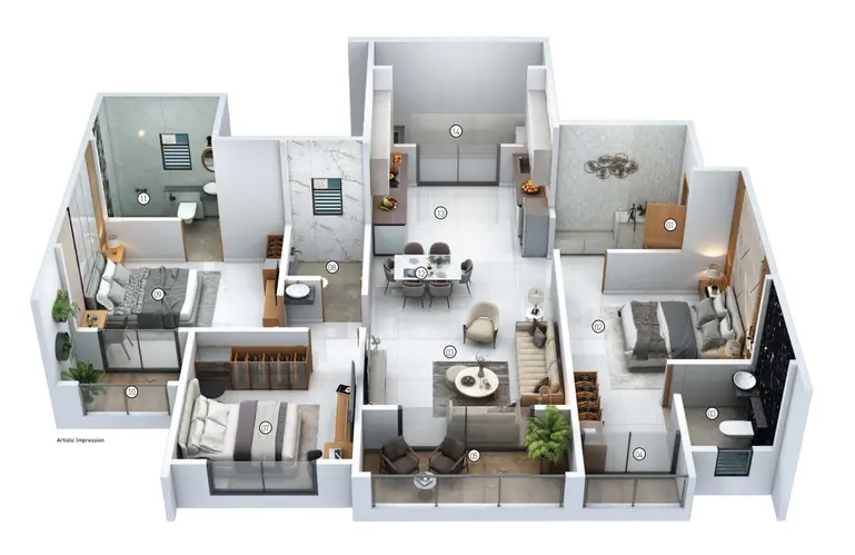The 3 BHK apartments are designed for families requiring additional space and flexibility. These homes typically feature a defined living and dining zone, three bedrooms including a master suite with an attached bathroom and balcony, and well-planned circulation that avoids wasted corridors. The layouts support work-from-home needs, multi-generational living, or future adaptability without compromising daily comfort.