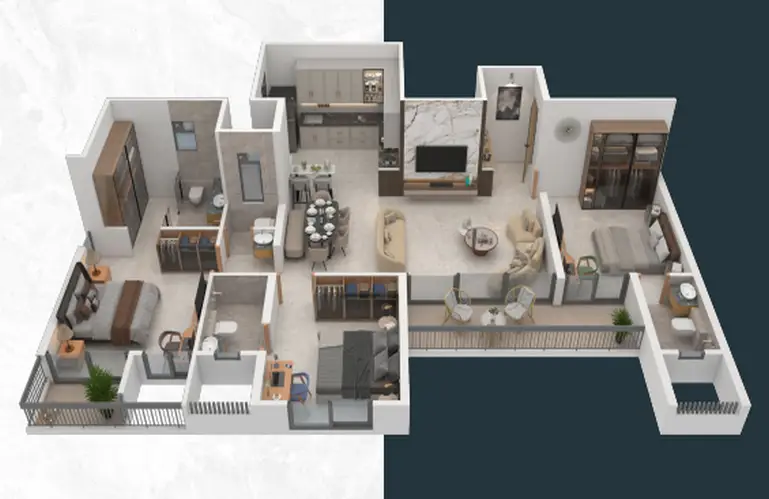 Every 3 BHK residence is meticulously planned to create expansive living environments that feel both grand and welcoming. Elegant living and dining zones seamlessly open to large private balconies overlooking serene green surroundings, creating an indoor-outdoor continuity that enhances everyday living. Four premium bathrooms, walk-in wardrobes in master bedrooms, and thoughtfully zoned private spaces elevate convenience, comfort and exclusivity.