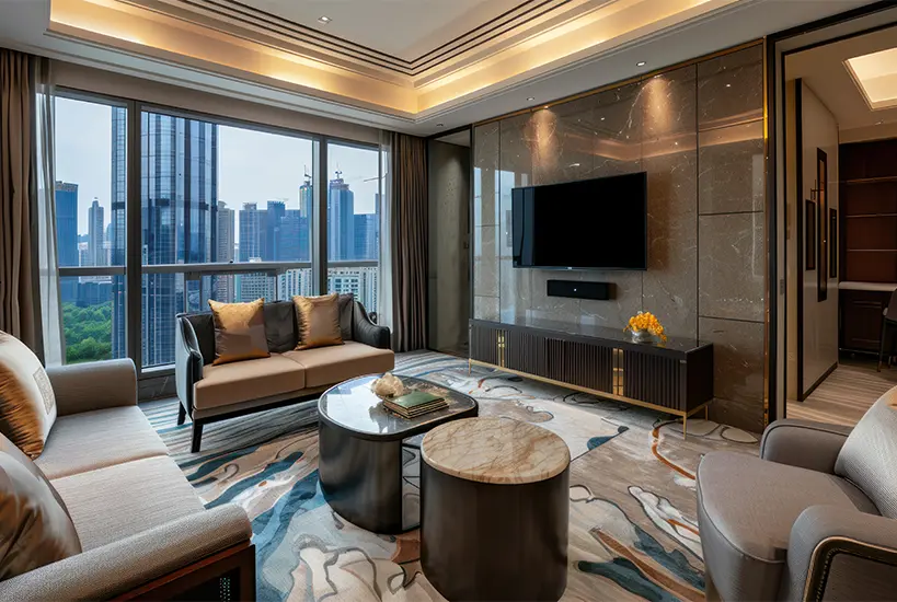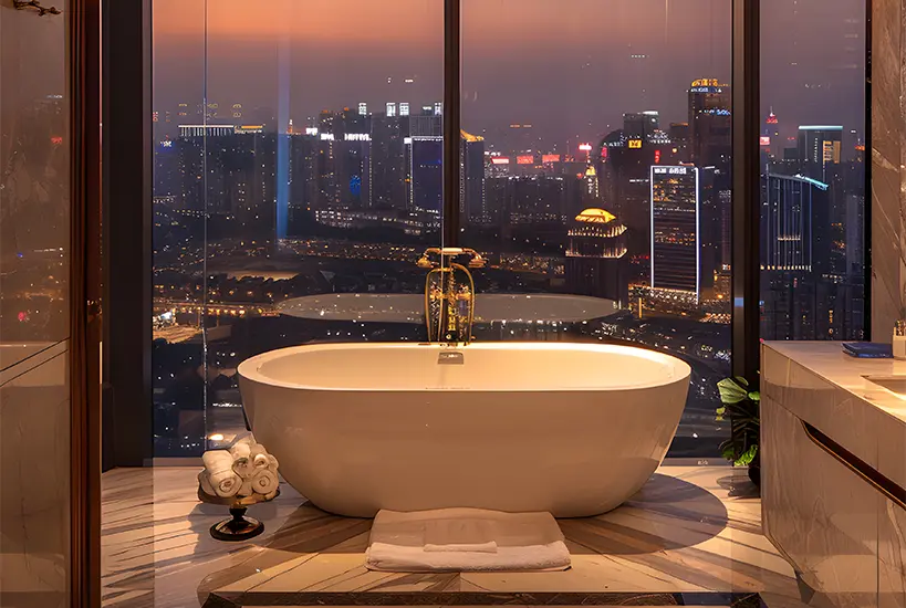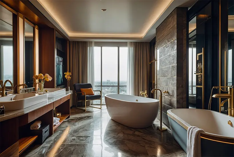 Bathrooms feature marble walls, premium fittings, and glass partitions, with solar-heated water for common bathrooms. Every detail reflects an uncompromising commitment to comfort and craftsmanship.