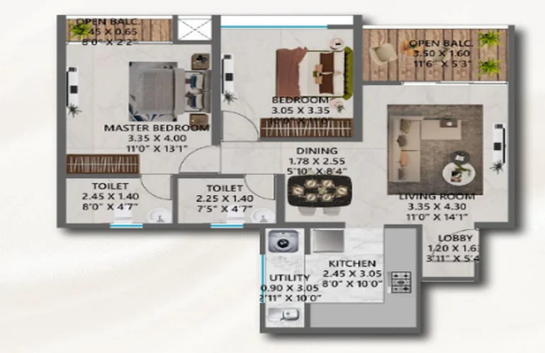 The spacious 2 BHK, 3 BHK, and 4 BHK apartments are thoughtfully configured with optimized room proportions, wide decks, full-length glass windows, and seamless indoor-outdoor transitions. Smart home automation, energy-efficient lighting, premium flooring, modular kitchens, and sophisticated bathroom fittings are standard, ensuring that luxury is experienced not just visually, but functionally every day.