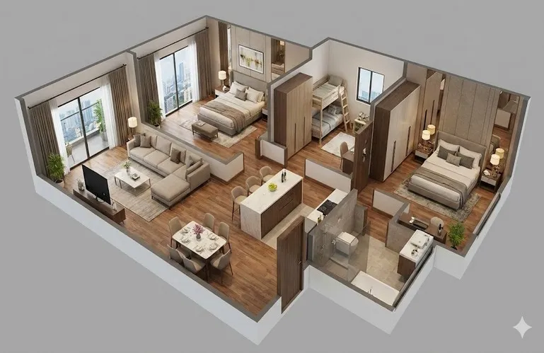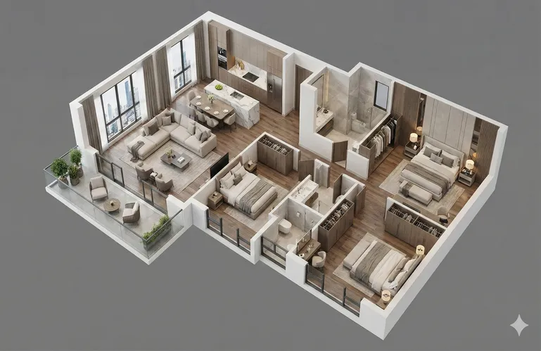 Homebuyers can choose between premium 2 BHK and spacious 3 BHK layouts, each intelligently planned to maximize usable space while preserving privacy and comfort. Living rooms flow seamlessly into sit-out balconies, kitchens are fully modular, and bedrooms feature full-height windows that open to tranquil city views.