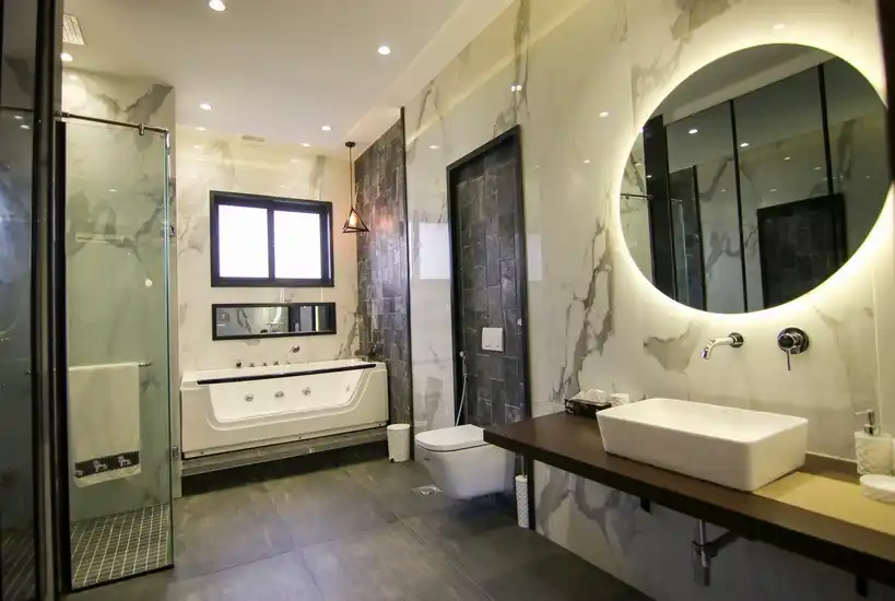 Premium bathroom fittings with glass shower partitions and quality sanitaryware