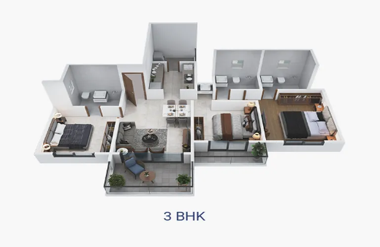 The 3 BHK residences cater to those seeking expansive living, offering clearly demarcated private and social zones, multiple balconies, and layouts that adapt effortlessly to evolving family needs.